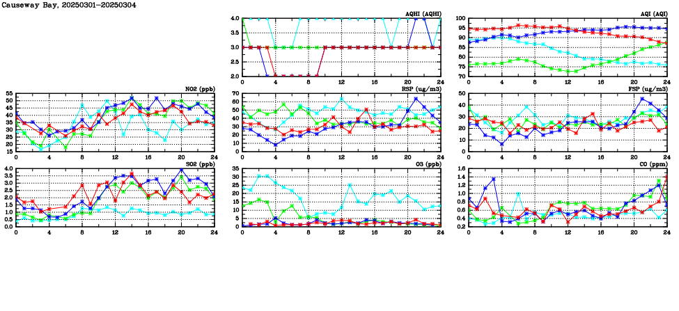 | Air Quality Data Time Series in Causeway Bay (2025/03/04) | ( Line colors: Day -3 Day -2 Day -1 Current day ) | 2D Map Current AQHI |