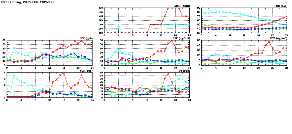 | Air Quality Data Time Series in Kwai Chung (2025/03/08) | ( Line colors: Day -3 Day -2 Day -1 Current day ) | 2D Map Current AQHI |