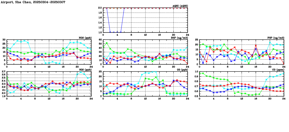 | Air Quality Data Time Series in Airport, Sha Chau (2025/03/07) | ( Line colors: Day -3 Day -2 Day -1 Current day ) | 2D Map Current AQHI |