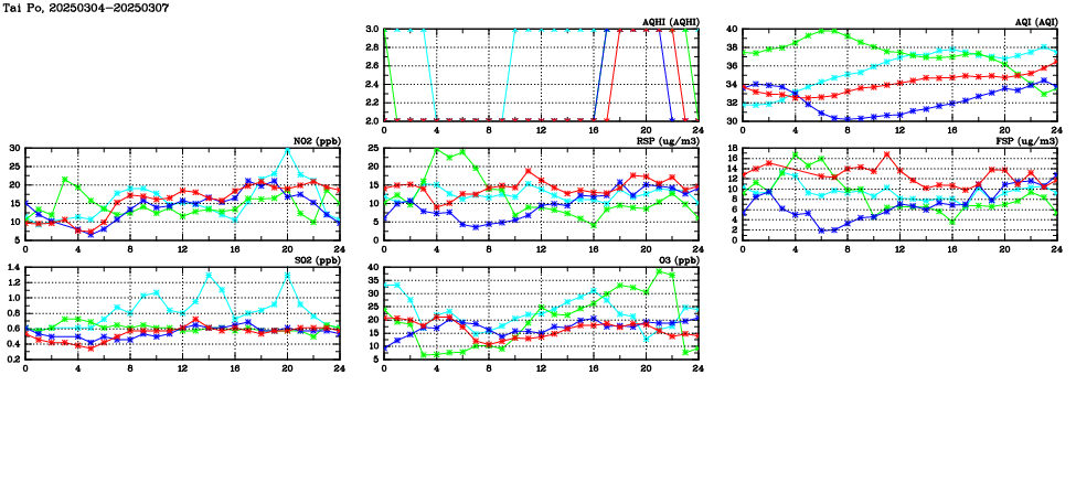 | Air Quality Data Time Series in Tai Po (2025/03/07) | ( Line colors: Day -3 Day -2 Day -1 Current day ) | 2D Map Current AQHI |