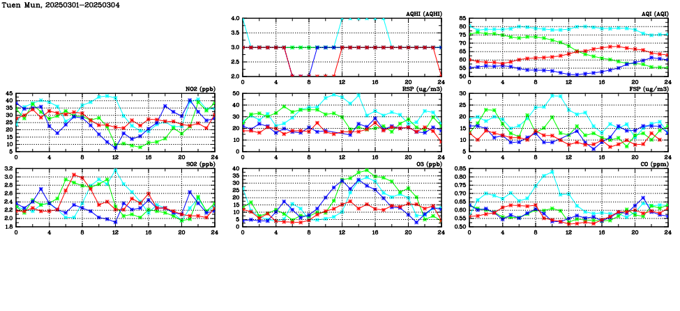 | Air Quality Data Time Series in Tuen Mun (2025/03/04) | ( Line colors: Day -3 Day -2 Day -1 Current day ) | 2D Map Current AQHI |