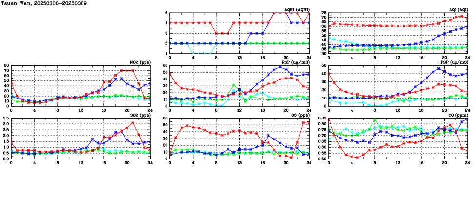 | Air Quality Data Time Series in Tsuen Wan (2025/03/09) | ( Line colors: Day -3 Day -2 Day -1 Current day ) | 2D Map Current AQHI |