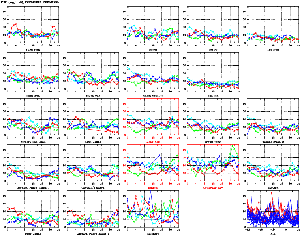 | Air Quality Data Time Series for FSP (2025/03/05) | ( Line colors: Day -3 Day -2 Day -1 Current day ) | 2D Map Current AQHI |