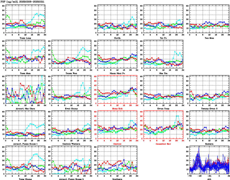 | Air Quality Data Time Series for FSP (2025/03/11) | ( Line colors: Day -3 Day -2 Day -1 Current day ) | 2D Map Current AQHI |