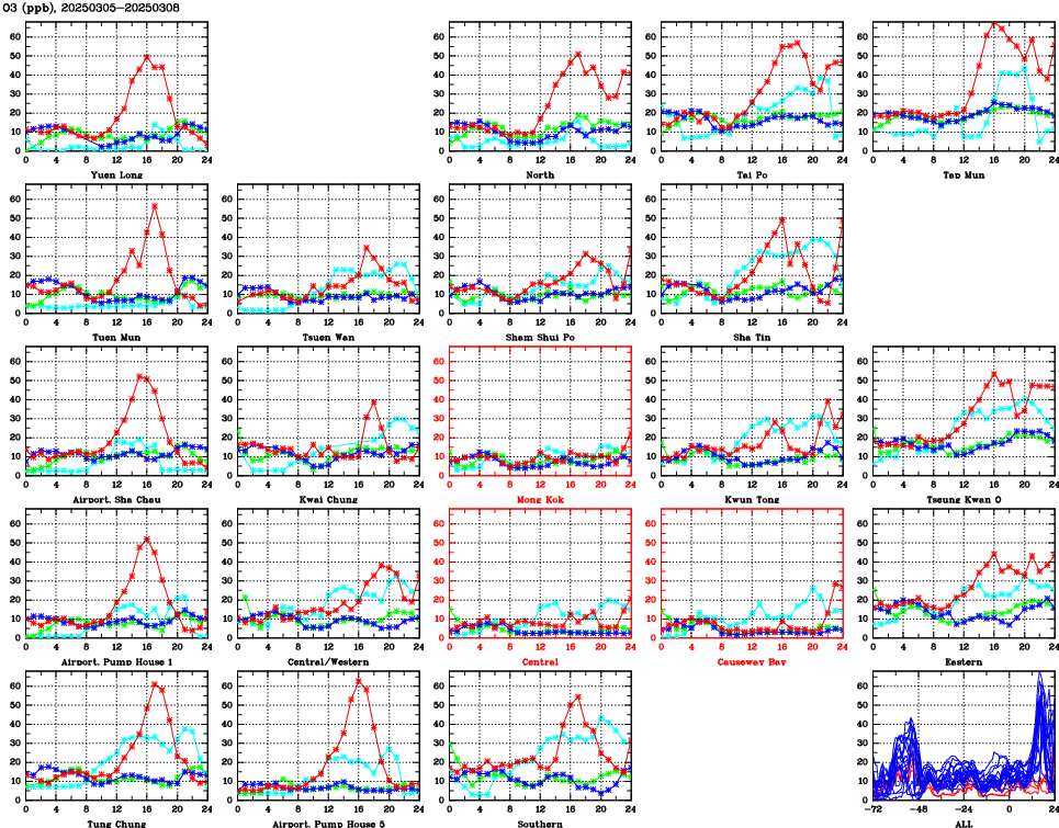 | Air Quality Data Time Series for O3 (2025/03/08) | ( Line colors: Day -3 Day -2 Day -1 Current day ) | 2D Map Current AQHI |