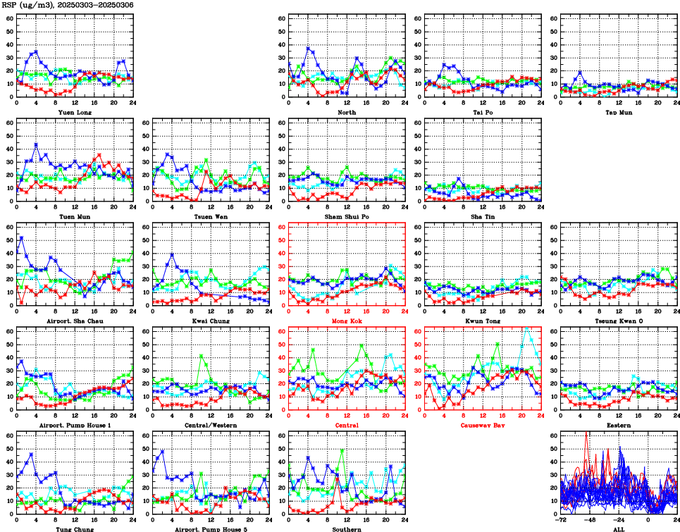 | Air Quality Data Time Series for RSP (2025/03/06) | ( Line colors: Day -3 Day -2 Day -1 Current day ) | 2D Map Current AQHI |