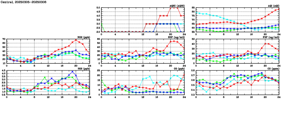 | Air Quality Data Time Series in Central (2025/03/08) | ( Line colors: Day -3 Day -2 Day -1 Current day ) | 2D Map Current AQHI |