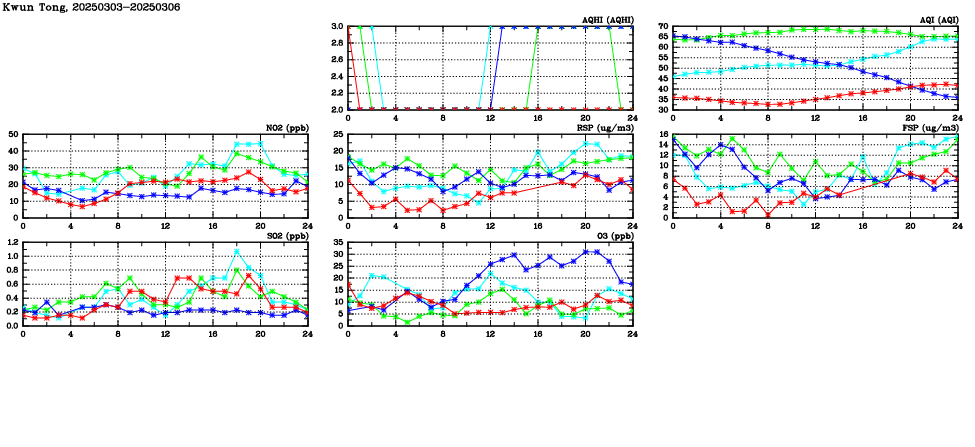 | Air Quality Data Time Series in Kwun Tong (2025/03/06) | ( Line colors: Day -3 Day -2 Day -1 Current day ) | 2D Map Current AQHI |