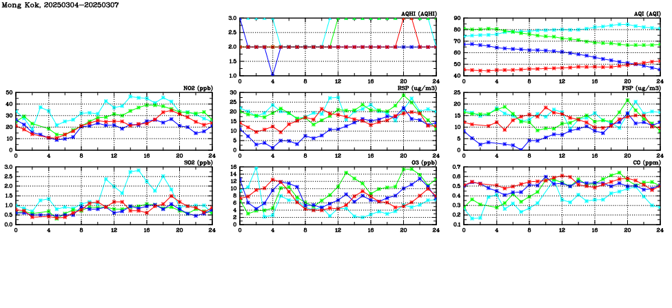 | Air Quality Data Time Series in Mong Kok (2025/03/07) | ( Line colors: Day -3 Day -2 Day -1 Current day ) | 2D Map Current AQHI |