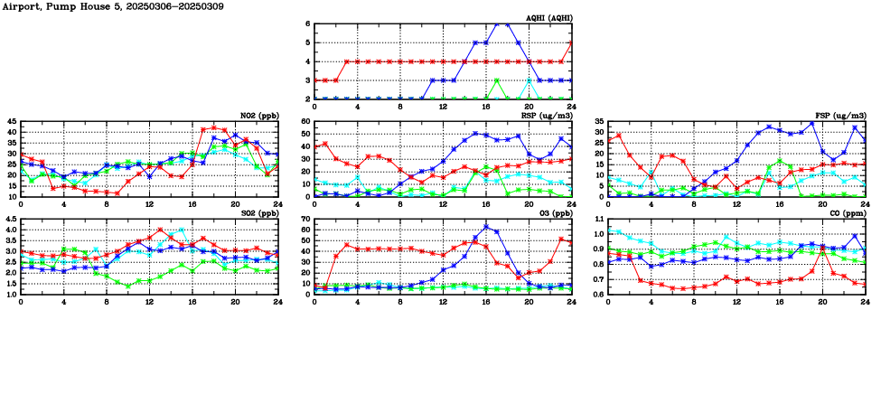 | Air Quality Data Time Series in Airport, Pump House 5 (2025/03/09) | ( Line colors: Day -3 Day -2 Day -1 Current day ) | 2D Map Current AQHI |