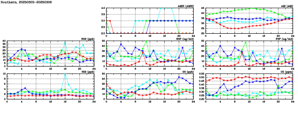| Air Quality Data Time Series in Southern (2025/03/06) | ( Line colors: Day -3 Day -2 Day -1 Current day ) | 2D Map Current AQHI |