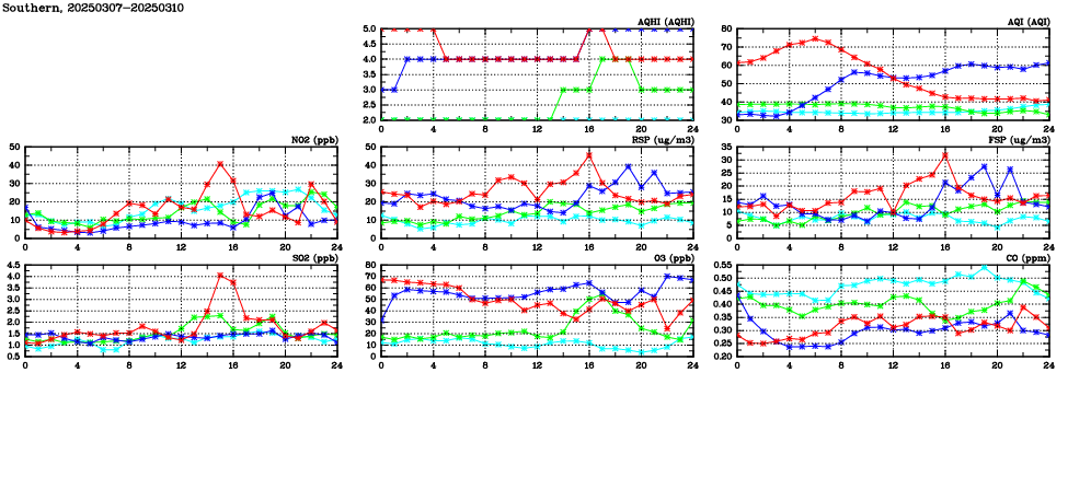 | Air Quality Data Time Series in Southern (2025/03/10) | ( Line colors: Day -3 Day -2 Day -1 Current day ) | 2D Map Current AQHI |
