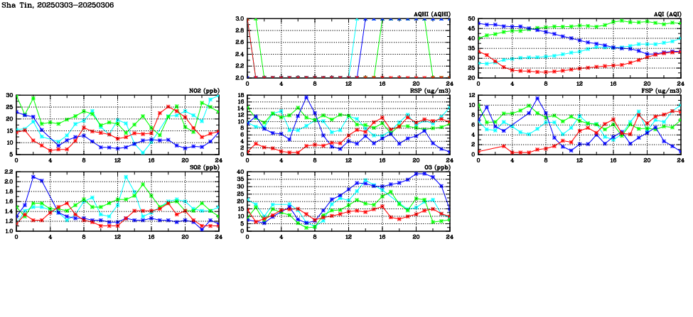 | Air Quality Data Time Series in Sha Tin (2025/03/06) | ( Line colors: Day -3 Day -2 Day -1 Current day ) | 2D Map Current AQHI |