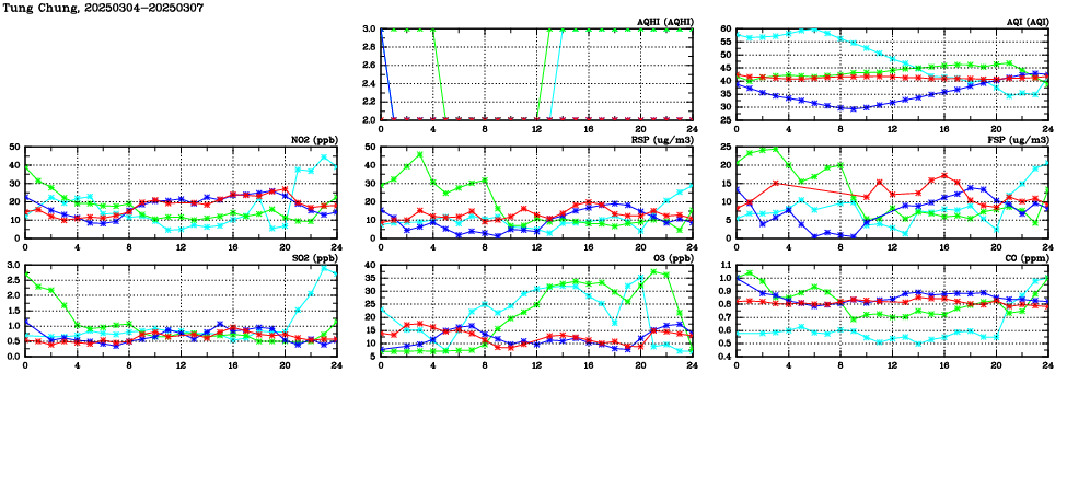 | Air Quality Data Time Series in Tung Chung (2025/03/07) | ( Line colors: Day -3 Day -2 Day -1 Current day ) | 2D Map Current AQHI |