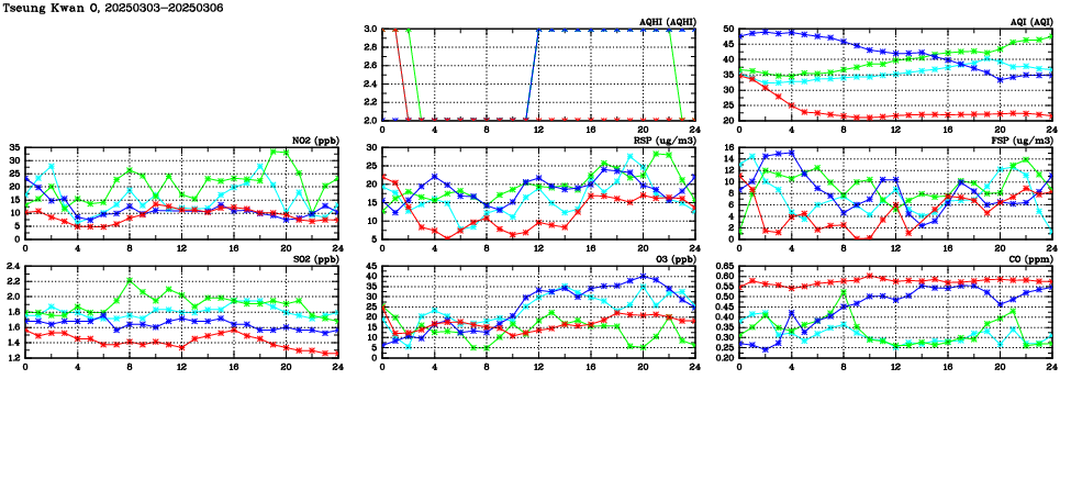 | Air Quality Data Time Series in Tseung Kwan O (2025/03/06) | ( Line colors: Day -3 Day -2 Day -1 Current day ) | 2D Map Current AQHI |
