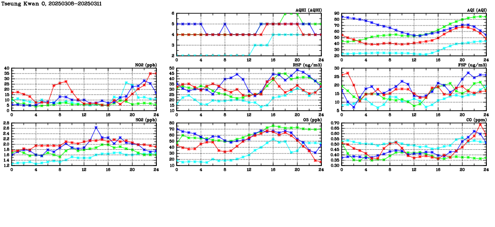 | Air Quality Data Time Series in Tseung Kwan O (2025/03/11) | ( Line colors: Day -3 Day -2 Day -1 Current day ) | 2D Map Current AQHI |