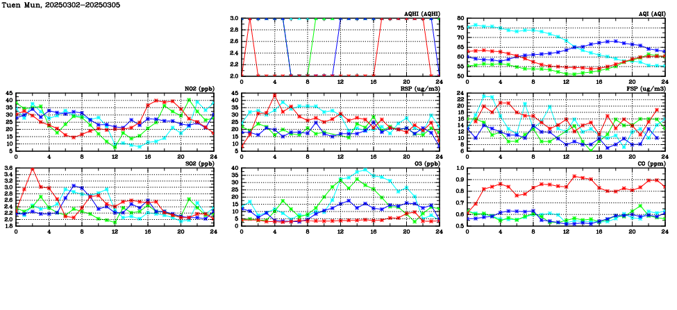 | Air Quality Data Time Series in Tuen Mun (2025/03/05) | ( Line colors: Day -3 Day -2 Day -1 Current day ) | 2D Map Current AQHI |