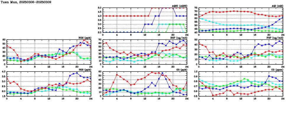 | Air Quality Data Time Series in Tuen Mun (2025/03/09) | ( Line colors: Day -3 Day -2 Day -1 Current day ) | 2D Map Current AQHI |