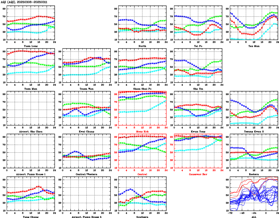 | Air Quality Data Time Series for AQI (2025/03/11) | ( Line colors: Day -3 Day -2 Day -1 Current day ) | 2D Map Current AQHI |