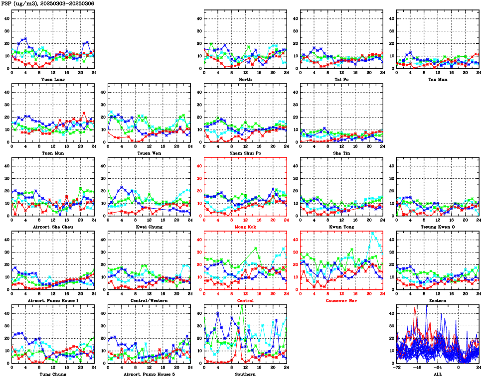 | Air Quality Data Time Series for FSP (2025/03/06) | ( Line colors: Day -3 Day -2 Day -1 Current day ) | 2D Map Current AQHI |