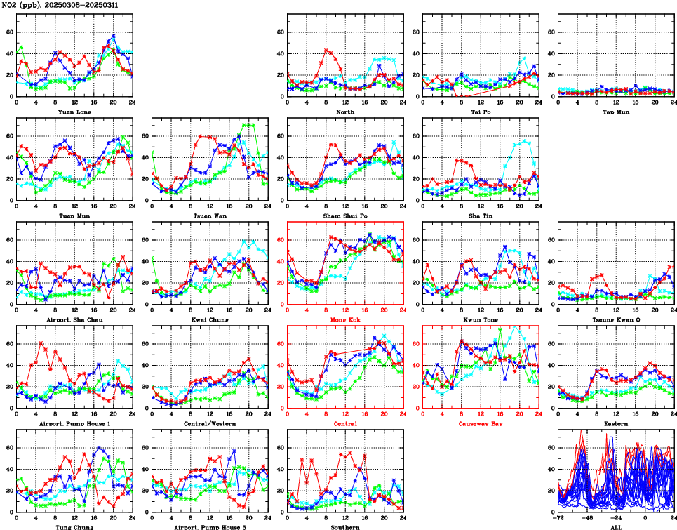 | Air Quality Data Time Series for NO2 (2025/03/11) | ( Line colors: Day -3 Day -2 Day -1 Current day ) | 2D Map Current AQHI |