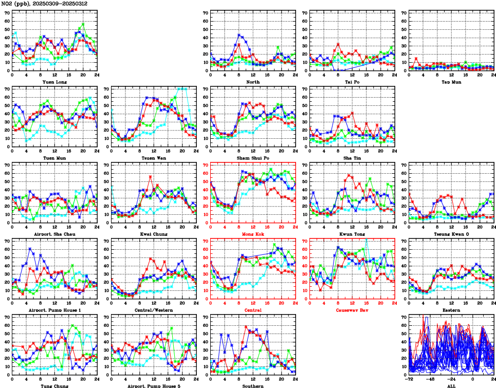 | Air Quality Data Time Series for NO2 (2025/03/12) | ( Line colors: Day -3 Day -2 Day -1 Current day ) | 2D Map Current AQHI |