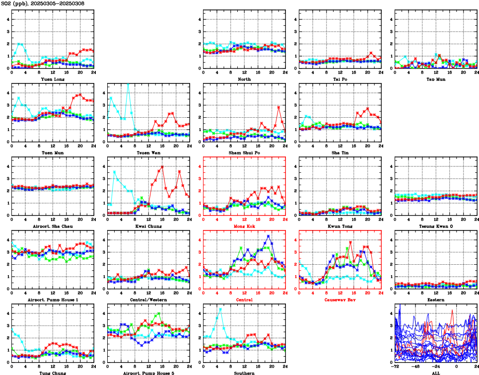 | Air Quality Data Time Series for SO2 (2025/03/08) | ( Line colors: Day -3 Day -2 Day -1 Current day ) | 2D Map Current AQHI |