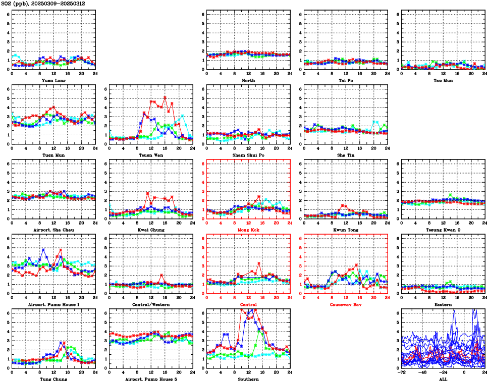 | Air Quality Data Time Series for SO2 (2025/03/12) | ( Line colors: Day -3 Day -2 Day -1 Current day ) | 2D Map Current AQHI |