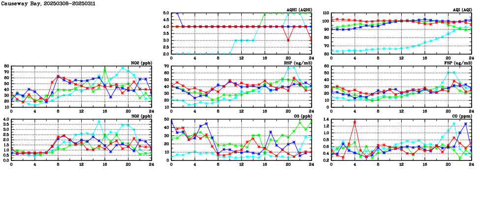 | Air Quality Data Time Series in Causeway Bay (2025/03/11) | ( Line colors: Day -3 Day -2 Day -1 Current day ) | 2D Map Current AQHI |