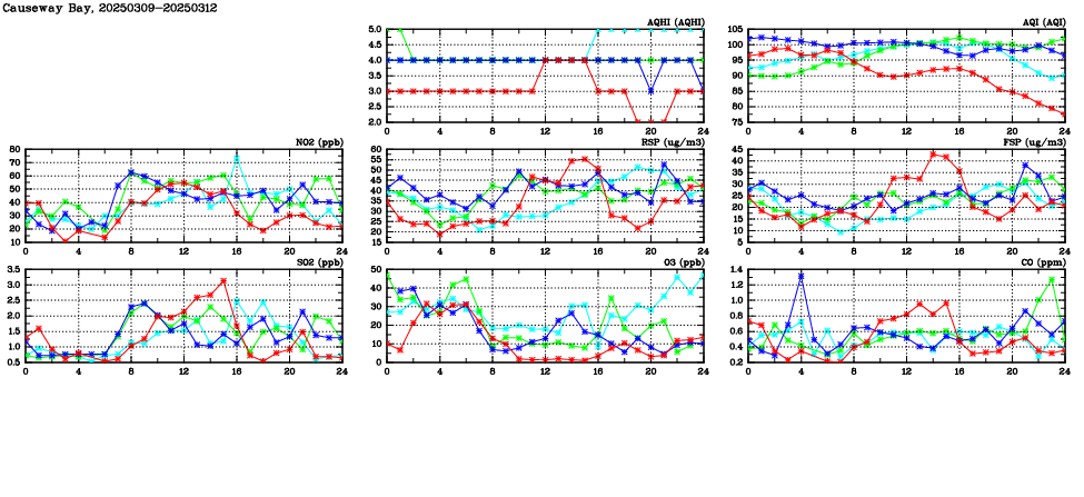 | Air Quality Data Time Series in Causeway Bay (2025/03/12) | ( Line colors: Day -3 Day -2 Day -1 Current day ) | 2D Map Current AQHI |