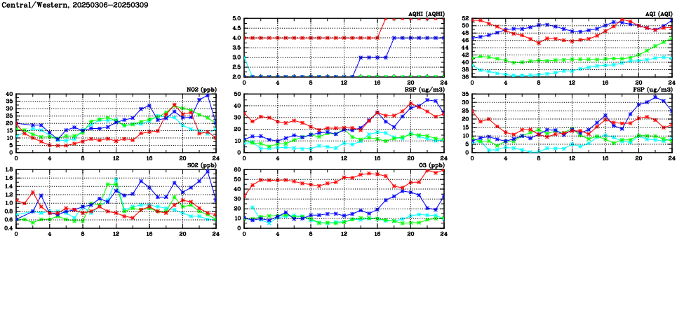 | Air Quality Data Time Series in Central/Western (2025/03/09) | ( Line colors: Day -3 Day -2 Day -1 Current day ) | 2D Map Current AQHI |