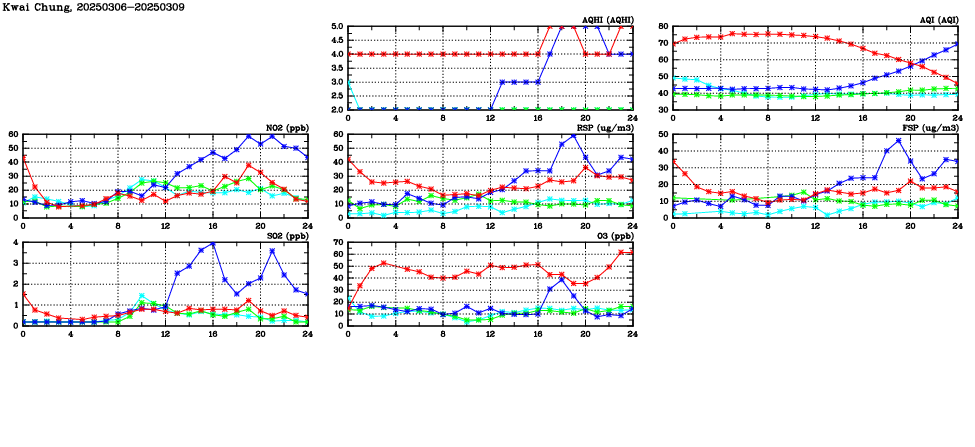 | Air Quality Data Time Series in Kwai Chung (2025/03/09) | ( Line colors: Day -3 Day -2 Day -1 Current day ) | 2D Map Current AQHI |
