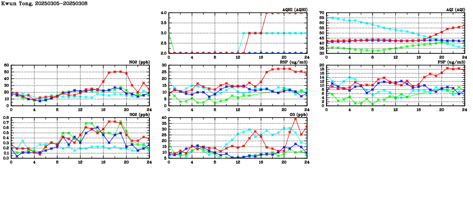 | Air Quality Data Time Series in Kwun Tong (2025/03/08) | ( Line colors: Day -3 Day -2 Day -1 Current day ) | 2D Map Current AQHI |