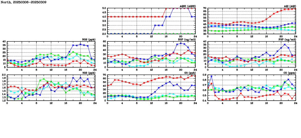 | Air Quality Data Time Series in North (2025/03/09) | ( Line colors: Day -3 Day -2 Day -1 Current day ) | 2D Map Current AQHI |