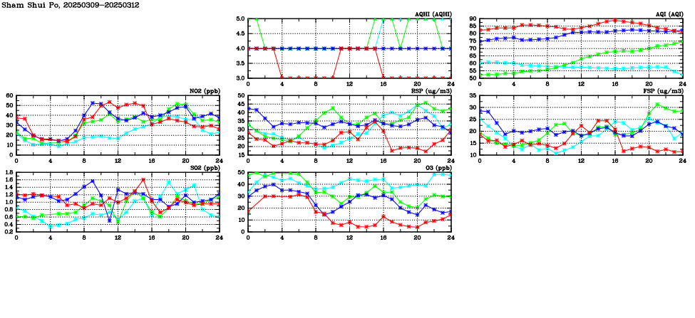 | Air Quality Data Time Series in Sham Shui Po (2025/03/12) | ( Line colors: Day -3 Day -2 Day -1 Current day ) | 2D Map Current AQHI |
