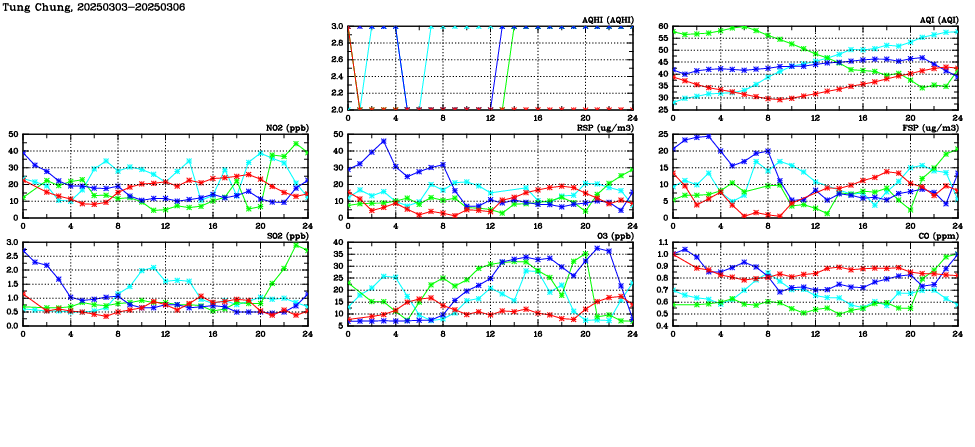 | Air Quality Data Time Series in Tung Chung (2025/03/06) | ( Line colors: Day -3 Day -2 Day -1 Current day ) | 2D Map Current AQHI |