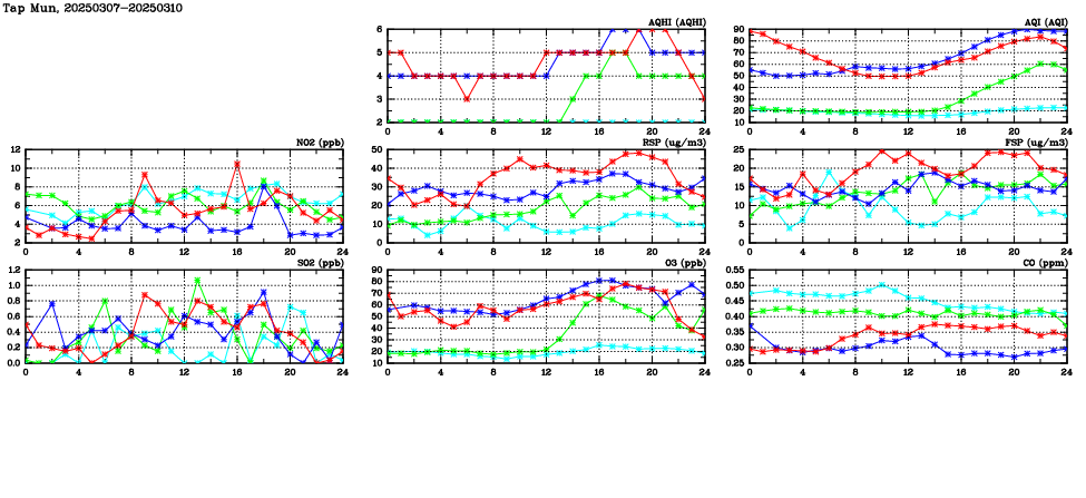 | Air Quality Data Time Series in Tap Mun (2025/03/10) | ( Line colors: Day -3 Day -2 Day -1 Current day ) | 2D Map Current AQHI |