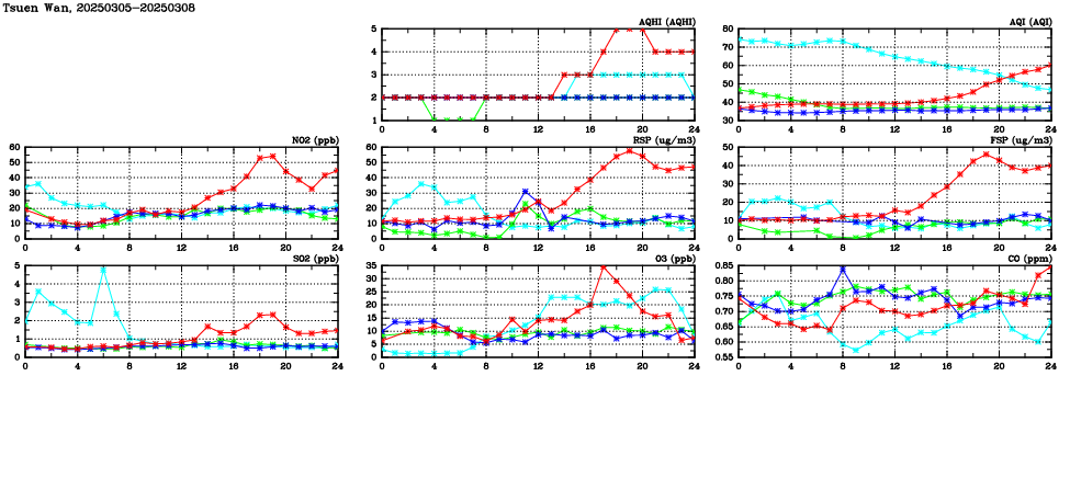 | Air Quality Data Time Series in Tsuen Wan (2025/03/08) | ( Line colors: Day -3 Day -2 Day -1 Current day ) | 2D Map Current AQHI |