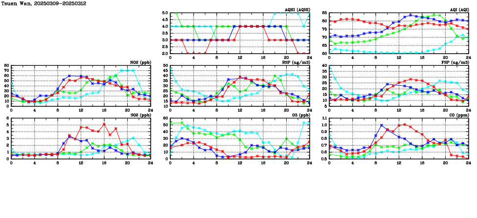 | Air Quality Data Time Series in Tsuen Wan (2025/03/12) | ( Line colors: Day -3 Day -2 Day -1 Current day ) | 2D Map Current AQHI |
