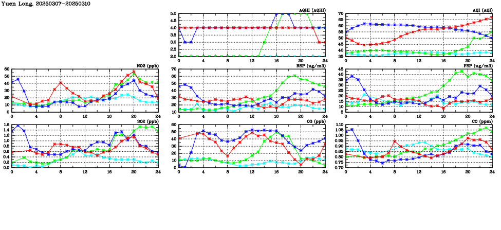 | Air Quality Data Time Series in Yuen Long (2025/03/10) | ( Line colors: Day -3 Day -2 Day -1 Current day ) | 2D Map Current AQHI |