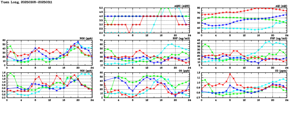 | Air Quality Data Time Series in Yuen Long (2025/03/11) | ( Line colors: Day -3 Day -2 Day -1 Current day ) | 2D Map Current AQHI |