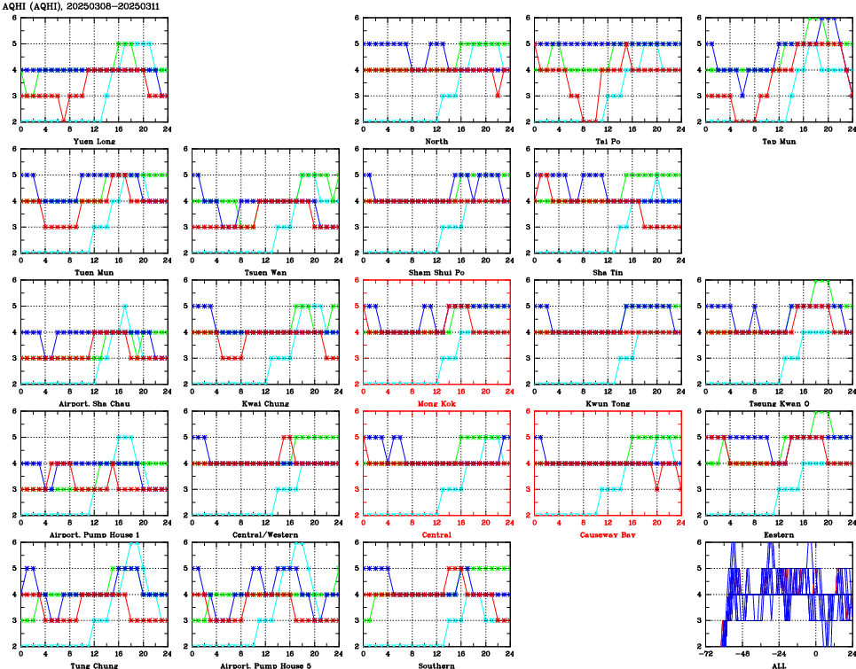 | Air Quality Data Time Series for AQHI (2025/03/11) | ( Line colors: Day -3 Day -2 Day -1 Current day ) | 2D Map Current AQHI |