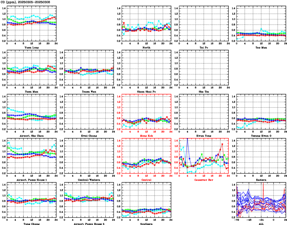 | Air Quality Data Time Series for CO (2025/03/08) | ( Line colors: Day -3 Day -2 Day -1 Current day ) | 2D Map Current AQHI |