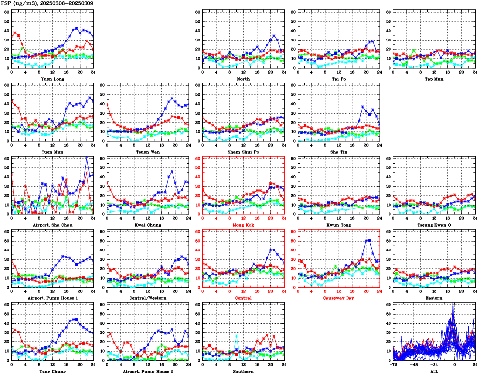 | Air Quality Data Time Series for FSP (2025/03/09) | ( Line colors: Day -3 Day -2 Day -1 Current day ) | 2D Map Current AQHI |