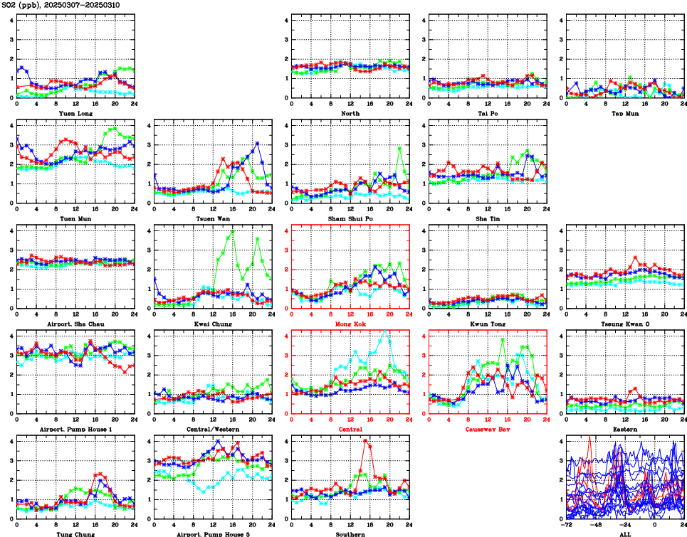 | Air Quality Data Time Series for SO2 (2025/03/10) | ( Line colors: Day -3 Day -2 Day -1 Current day ) | 2D Map Current AQHI |