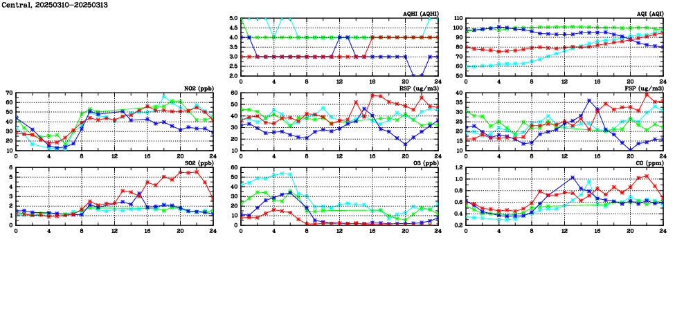 | Air Quality Data Time Series in Central (2025/03/13) | ( Line colors: Day -3 Day -2 Day -1 Current day ) | 2D Map Current AQHI |