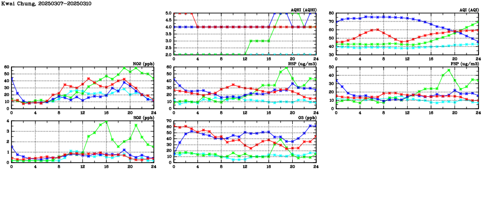 | Air Quality Data Time Series in Kwai Chung (2025/03/10) | ( Line colors: Day -3 Day -2 Day -1 Current day ) | 2D Map Current AQHI |