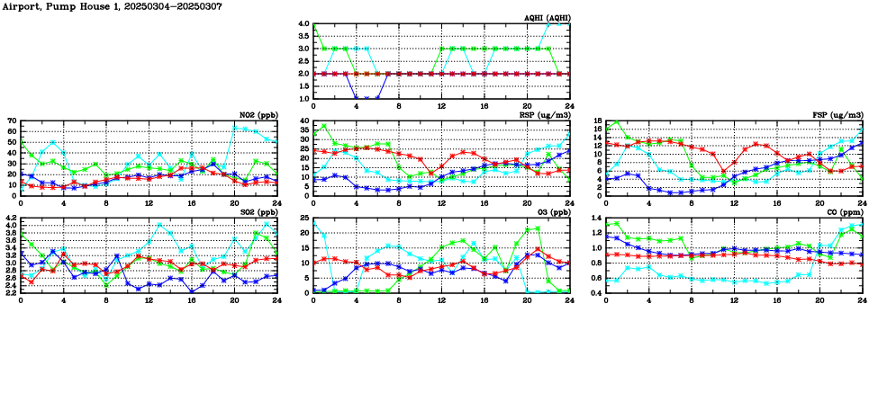 | Air Quality Data Time Series in Airport, Pump House 1 (2025/03/07) | ( Line colors: Day -3 Day -2 Day -1 Current day ) | 2D Map Current AQHI |