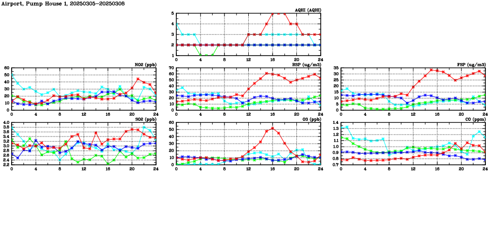 | Air Quality Data Time Series in Airport, Pump House 1 (2025/03/08) | ( Line colors: Day -3 Day -2 Day -1 Current day ) | 2D Map Current AQHI |