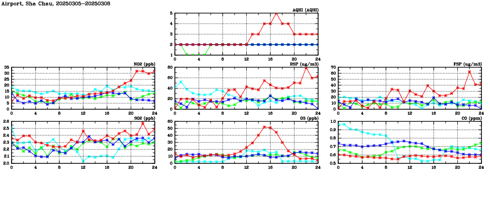 | Air Quality Data Time Series in Airport, Sha Chau (2025/03/08) | ( Line colors: Day -3 Day -2 Day -1 Current day ) | 2D Map Current AQHI |